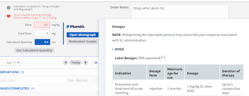 Available in the sidebar where you can search by product name, or on the treatment sheet as you’re ordering a medication, our Plumb’s integration makes it easy to verify dosages, review contraindications, and even check up on potential interactions.